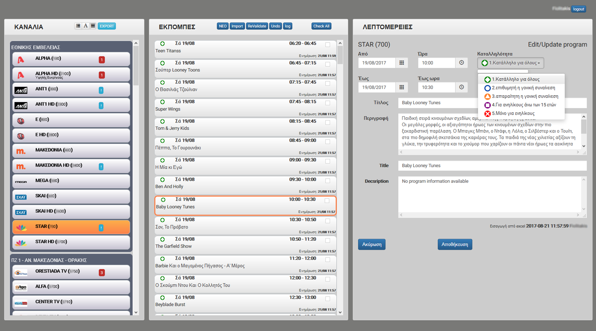 ● Batch excel import per Greek channel or manual insert/update of a PID